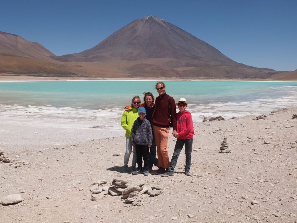 La Laguna Verde, (cuivre, arsenic) au pied du Volcan Licancabur, avec juste derrière le Chili (San Pedro de Atacama)