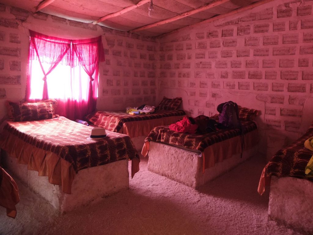 Nous avons dormi dans des villages hauts situés, et le dernier soir dans un hôtel de sel, où les lits, sièges, tables, murs et sols sont en sel !